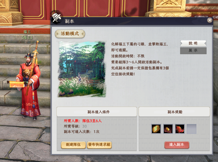 需三人以上組隊前往福王別苑,進入副本後,福王將要求大俠闖過三道考驗,才能入席赴宴。